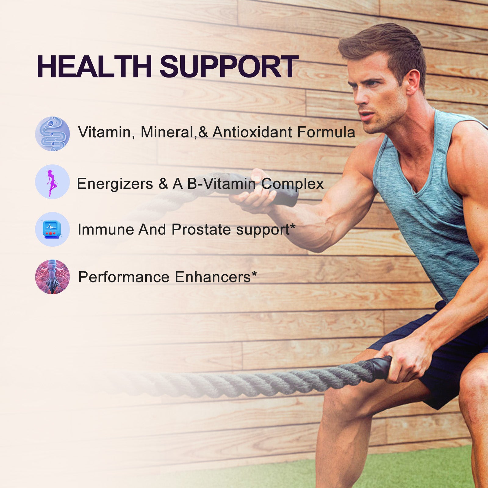 Daily multivitamin designed for men's health, combining vitamins, minerals, antioxidants, and herbs to support energy production, immune function, and prostate wellness. Non-GMO, sugar-free, gluten-free formula with 100% natural ingredients. Manufactured in FDA-registered facilities, NSF cGMP certified.